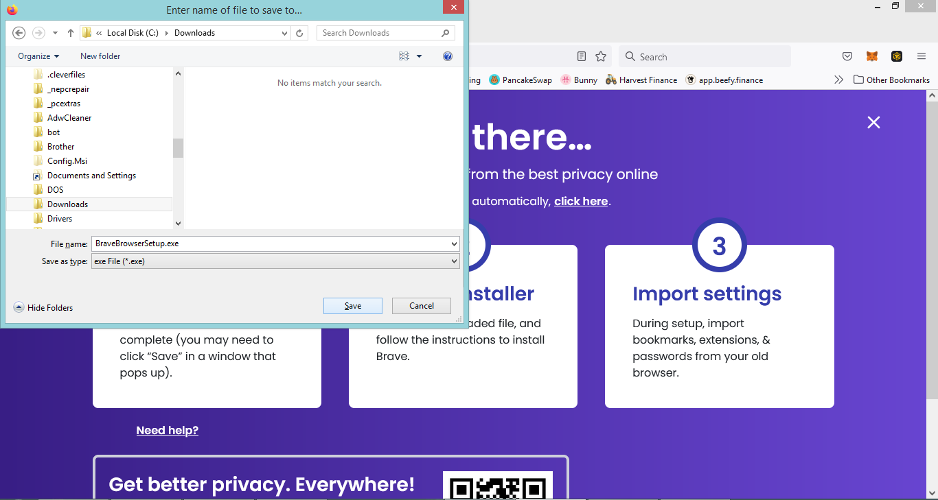 **2.** Once the page loads, right on the main page, you will see a “**Download Brave**” button. Click on it. Then a box will pop up asking where to save the file. Pick a location, and click “Save”.