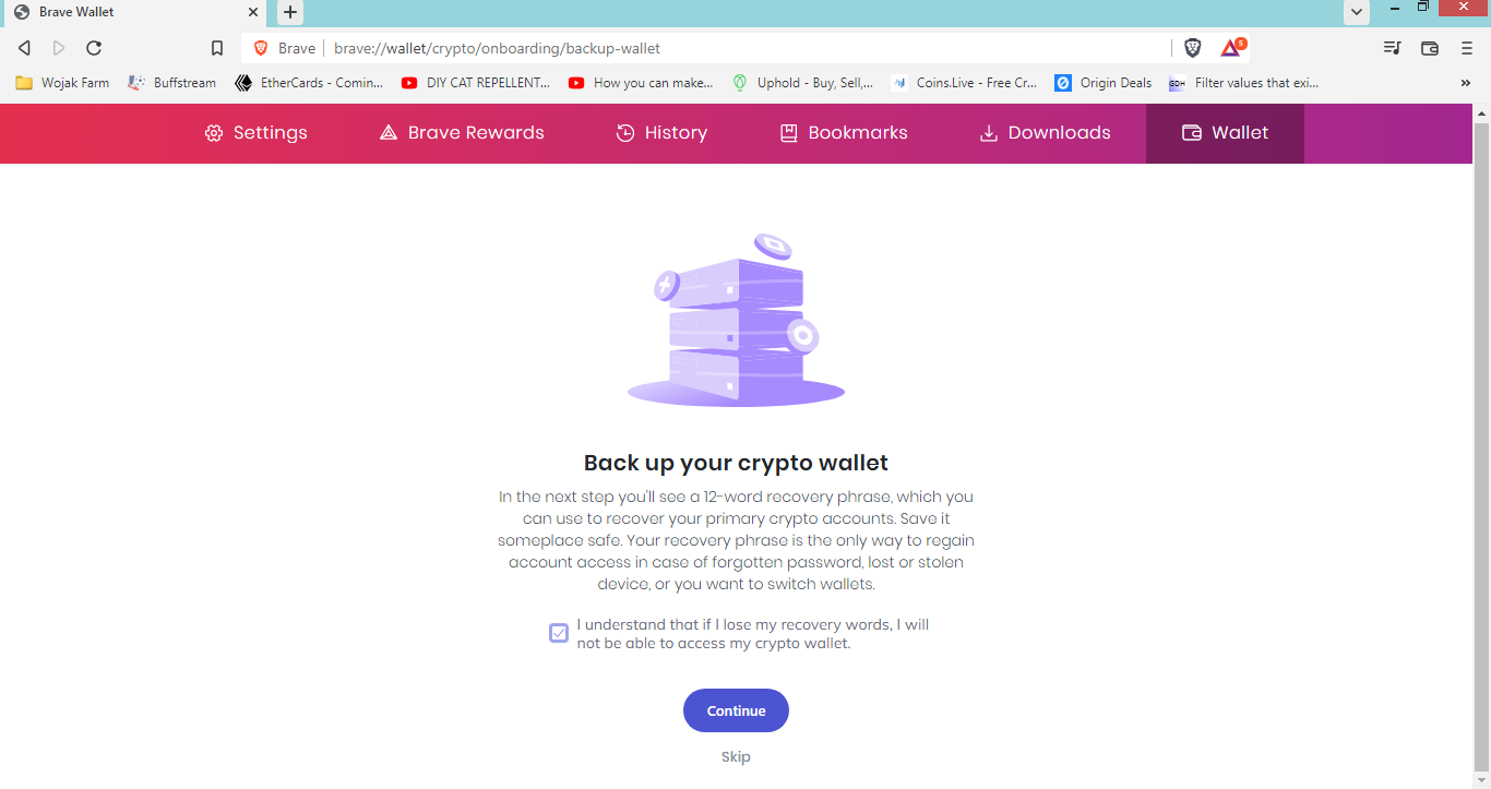 **5.** Now you will be brought to the “Back up your crypto wallet” screen. This is a **VERY IMPORTANT step. DO NOT SKIP THIS!**