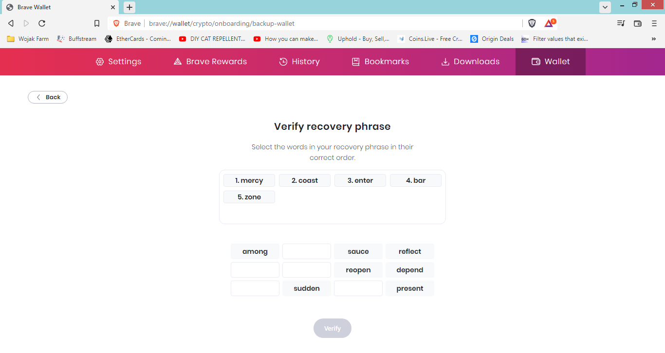 <figure><img src="https://653879926-files.gitbook.io/~/files/v0/b/gitbook-x-prod.appspot.com/o/spaces%2FMI8zWnXu9eyqfz97rj0K%2Fuploads%2Fgit-blob-dff0926de6b2f5c662c71c73a1a72179ca4198a7%2Fbrave_07.png?alt=media" alt=""><figcaption><p>Step 6: Verify the recovery phrase that you have just created.</p></figcaption></figure>